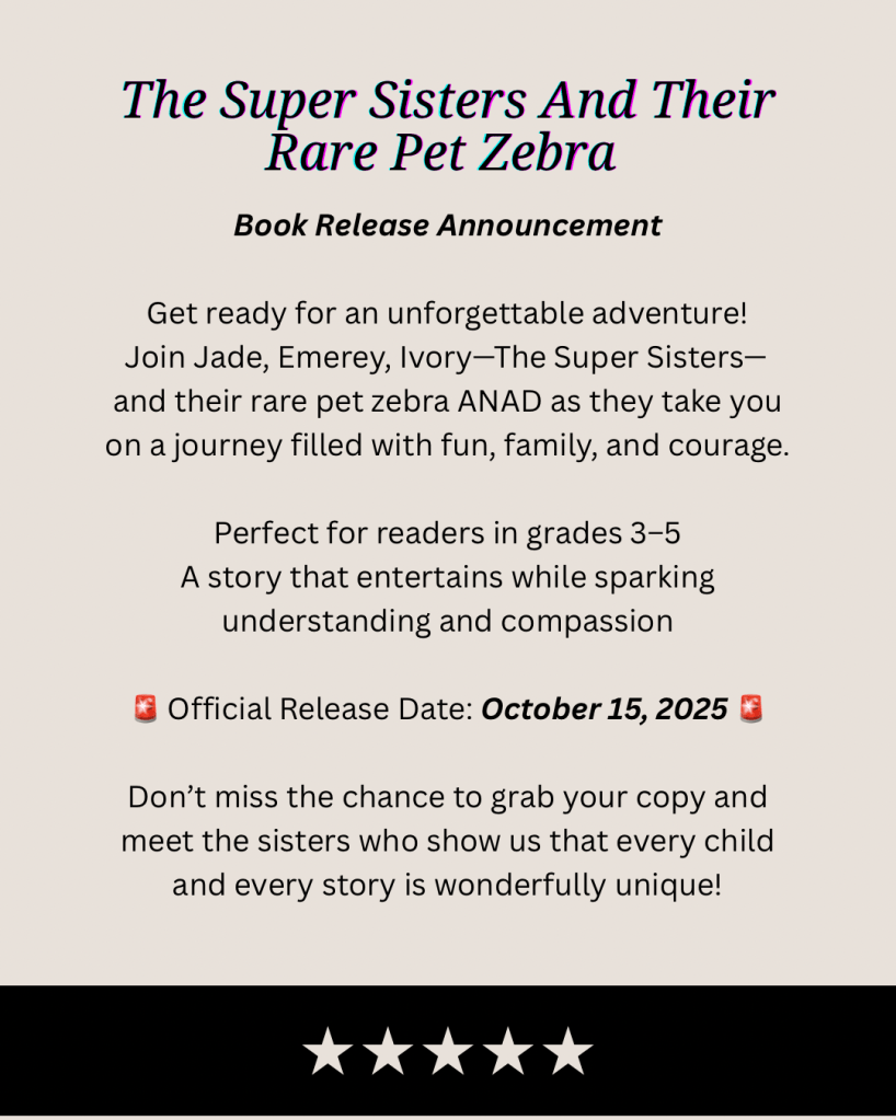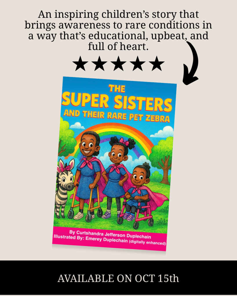 The Super Sisters And Their Rare Pet Zebra is a book dedicated to my daughters, a testament to their bravery as we strive to raise awareness and find a cure for the rare genetic disorder known as INAD. My youngest and oldest daughters have been diagnosed with the Atypical form of INAD, referred to as ANAD (Atypical Neuroaxonal Dystrophy), a rare genetic disorder characterized by regressions, loss of vision, muscular control and mental skills, yet they continue to inspire us with their resilience. INAD stands for Infantile Neuroaxonal Dystrophy. The purpose of this book is to provide insight into my daughters’ experiences as we navigate life together while combating this disease, which has significantly impacted their physical mobility. This book offers an educational experience, shedding light on the challenges of living with a rare disease. The zebra featured in the book serves as a symbol for Rare Diseases.